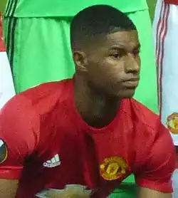 In 2015, United Under-19s manager Nicky Butt praised Rashford's performances for the team in a group stage match of the UEFA Youth League.[29] His inclusion in the team began following an injury to Demetri Mitchell, and he capitalised on his chance by scoring six goals in 11 games in the Under-18's Premier League, as well as three goals in the Youth League.[30] He was awarded the captaincy of the team by Butt, who hailed him as a leader.[31] Rashford was named on the first-team bench for the first time on 21 November by Louis van Gaal for a Premier League match against Watford, which Manchester United won 2–1.[32] He received the number 39 squad number, due to Van Gaal's insistence that strikers wear a squad number containing a nine.[33] The following week against Leicester City, he was again named on the bench, but was again unused in a 1–1 draw.[34] In February 2016, Rashford was subject to a loan bid from League One club Crewe Alexandra, but the temporary transfer was rejected by Reserves manager Warren Joyce.[35][36] Former teammate Sean Goss described how Rashford impressed in first-team training sessions while the club was suffering an injury crisis, despite being one of the younger players called up to train.[37]