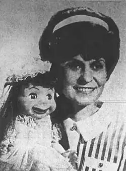 Tigner's first record to utilize her childlike voice was released September 1960, made for Cornerstone Records and entitled Happy Day Express: Sing With Marcy.[3][5] Despite only four months' circulation, it was the tenth-best selling religious record of 1960.[5] Tigner commenced a tour to promote the album, but she felt ill-at-ease performing as a grown-up woman while performing children's songs with her decidedly immature voice.[8] She became acquainted with Vonda Kay Van Dyke, who would later be Miss America 1965, while working on the film Teenage Diary. Van Dyke encouraged her to study Paul Winchell's book on ventriloquism.[2][9] By April 1961 a doll named Little Marcy was created by the same dollmaker who made Charlie McCarthy, based on Tigner's specifications of herself as a small child, and this doll became so popular through personal appearances that Tigner's name was dropped and further recordings and appearances were simply credited to "Little Marcy."[2][5][6] Tigner made Little Marcy recordings for many of the most significant Christian record labels, including Singcord, Word, and Zondervan.[2] She had a weekly radio show at KWIL in 1965.[10] At the peak of her output she was releasing 5 albums of original material a year, and sales figures were respectable by even secular standards.[2][11] These albums were repeatedly repackaged as budget albums and for other Christian labels such as Chapel Records.[2][12] In addition to strictly Christian material, Little Marcy released recordings which would otherwise receive the approval of her Christian base, including a 1969 fire-safety record in which she is partnered with Smokey Bear.[2]