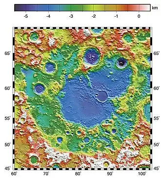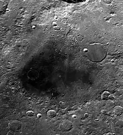 The basin material is of the Nectarian epoch,[2] with the mare material being of the Upper Imbrian epoch (3.4–3.7 Ga).[3] The lighter gray area to the southeast of the dark mare material is a region of hills within the basin. The rim of this basin forms a mountain range that can be seen under oblique lighting conditions.