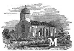 The church in the 1840s was a slated roofed brick building with buttresses, with a wooden cupola at the western end.[10]