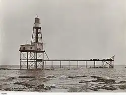 ![]() Cape Jaffa Lighthouse (circa 1910) showing the full lighthouse installation standing on the reef. The lantern room and keepers accommodation on the left hand side of the image were removed during the 1970s. | |