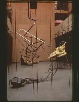 Cogswell's early sculpture centered on abstract constructions using basic natural and human-made materials—most often rough-hewn wood (sometimes marked with expressive chainsaw kerfs), steel plates and rods, and tension wire.[3][28] This work explored the intrinsic beauty of these materials in compositions that alluded to rhythms of nature, social systems, structures and the tenuousness of life, or served as concrete expressions of emotional states (e.g., Inexplicable Longings, 1989).[33][6][23][34]
