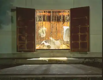 In subsequent installations, Cogswell delved into new materials and linear tensions, often created through enclosures or frames made of steel or wood.[28][37][1][38] Inside Yoknapatapha (Middlebury College, 1992) was inspired by the novels of William Faulkner, and consisted of a visceral environment of five separate elements composed of wood, steel, concrete, bluestone, beeswax and tar that evoked the volatility of nature and the layerings and conflicts of societies.[37] In works such as Memento Mori (Newhouse Center, 1995) and "The Parthenon and Other Mythologies" (Parthenon Museum, 1995), Cogswell created mysterious, shrine-like environments that incorporated hanging lengths of tarred straw rope, sheets of wire mesh covered with newspaper or prints embedded in plaster and/or wax, calligraphic knotted and unknotted ropes, and materials used in rituals, such as straw and salt.[29][39][40] Memento Mori was recreated at the Newhouse Center after first being installed in an abandoned temple in Kanazawa, Japan.[29][31] Parthenon was a collaboration with her brother, painter Jim Cogswell, that was based on the original Greek structure (and its Nashville replica) and used suspended books and records and hanging prints to represent, respectively, plumb bobs and columns.[41][38] Reviews described these installations of the 1990s as poignant and raw evocations of memory, ritual and connection to the historical and mythical past.[29][38]