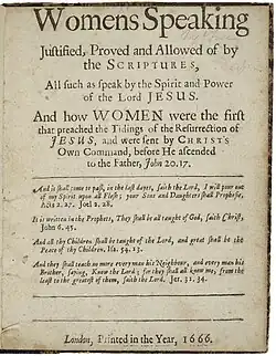 - ^ Margaret Fell, ""Women's Speaking Justified, Proved, and Allowed of by the Scriptures, All such as speak by the Spirit and Power of the Lord Jesus", Quaker Heritage Press Online Texts.