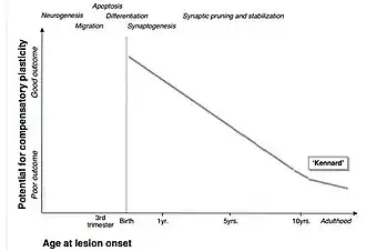 The observation that young brains reorganize more effectively than adult brains was first articulated by Kennard in 1936. Consequently, the notion that how well a brain can reorganize itself after damage as a function of the developmental stage is now known as the "Kennard principle".[6] This research led to one of the earliest experimental evidence for age effects on neuroplasticity.