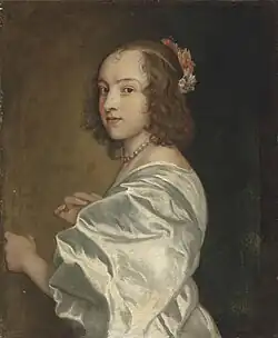 There is a portrait of her in the Frick Collection which was made in about 1638 by Van Dyck and which was lost for some years.[5] There is another in the Royal Collection which is kept at Hampton Court Palace.[3] In 2022 there were eight portraits of her in the National Portrait Gallery which were "after Anthony van Dyck".[6] Peter Lely's painting of her, in "The Concert", is in the Courtauld Institute. Contemporary copies and engravings of Van Dyck's painting of her as Flora exist although the original is lost.[2] The historian Susan E. James says that she was the most painted female commoner of the seventeenth century.[2]