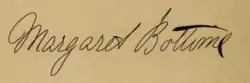 When Rev. Bottome was a pastor in the wealthy suburb of Tarrytown, New York, some of the summer residents heard of the talks Margaret was giving to a class which she led, and they came to listen to her. After that, for more than a quarter of a century, she lectured on the topic of "Bible Talks" in the drawing rooms and salons of wealthy women;[7] it was her most effective personal work.[8] In 1878, Rev. Bottome was thrown from his horse and killed. Instead of his death putting an end to Margaret's activities, it spurred her on to continue in religious work.[4] The couple had four sons. One of them, who became a physician, died young. Two sons became ministers, Rev. W. M. Bottome and Rev. George H. Bottome. The fourth, Harry H. Bottome, became a lawyer.[7]