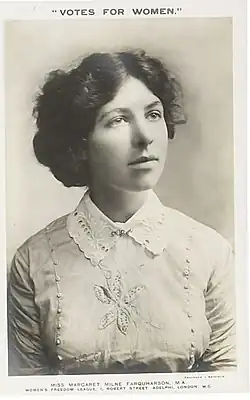 Margaret Milne McConnachie Farquharson (17 August 1884 – after 1936) was a Scottish suffragette, candidate for MP, leader of the National Political League and campaigner for Palestine.