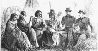 Thomas Fitzpatrick was an organizer and leader of the Fort Laramie Treaty Council of 1851. Poisal attended the meetings, having women attend the meetings meant as a sign of trust for a peaceful outcome by Native Americans. Eight tribes with around 10,000 Native Americans attended the council. The natives agreed to stop attacking travelers on trails that passed through traditional ceremonial and hunting grounds, including the Oregon Trail, and to cease warfare with other tribes. The government agreed to provide annuities for 50 years. After the treaty was signed, it was never officially recognized by the federal government and the United States Senate reduced the amount and length of the term of the annuities without consulting with the parties that formed the treaty. The treaty was also violated by both Native Americans and European Americans.[1] Fitzpatrick was a key party to the Fort Atkinson Treaty Council of 1853 in present southwest Kansas.[10]