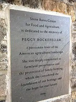 Margaret Rockefeller was the sole founder of the Maine Coast Heritage Trust and was its chair for a number of years.[9] The Trust has conserved around 66,000 acres and many buildings in Maine and works towards keeping wildlife habitats, establishing public access to the coast, and providing educational support.[10] One of the trust's projects is dedicated to the memory of Margaret Rockefeller, the Stone Barns Center, which displays a plaque commemorating her commitment to farmland preservation.
