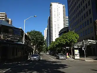Alice Street lies to the south, while Mary Street runs parallel to the north. Traffic flow along the street is restricted to one direction, towards the north east. From the south an exit ramp from the Riverside Expressway becomes Margaret Street at the William Street intersection.