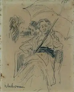 The town house built there according to plans by the architect Hugo Wach was designed to meet the needs of the collector Margarete Oppenheim with gallery space and special wall display cases. In addition, the couple had a summer residence built in the Alsen villa colony in Berlin-Wannsee. For this purpose, three contiguous plots of land were purchased, on which the Oppenheim country house was built according to plans by the architect Alfred Messel. The villa had its own gallery wing for Margarete Oppenheim's collection.[3] Even though Franz Oppenheim supported his wife in building up the art collection, he made it clear in a letter to Wilhelm Bode what division of responsibilities he saw in the Oppenheim household: "I am responsible for the management of the factory, the art department is under my wife.“ A fountain with penguin figures by the sculptor August Gaul was installed in the extensive garden of the country house. The garden architect Willy Lange laid out a rose garden for the rose grower Margarete Oppenheim. Among the neighbors at Wannsee was the painter Max Liebermann, a friend, who portrayed Margarete Oppenheim in various drawings in 1917 and painted various views of the garden. Another neighbor at Wannsee was the surgeon Ferdinand Sauerbruch.