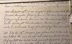 On August 7, 1781, a group of Tories and Native Americans forced their way into the Schuyler Mansion in Albany, searching for Philip Schuyler, whom they intended to make a prisoner of war.[2] According to a story which may be legend, family members and guests, including Eliza and Angelica, who were both pregnant, ran upstairs to hide, but soon realized they had left Philip and Catharine Schuyler's newborn daughter, Catharine (1781–1857), downstairs.[2] Peggy went downstairs to get the baby, but was threatened by one of the Native Americans, who asked where Philip was. Thinking quickly, Peggy replied that Schuyler had "gone to alarm the town".[2] Fearing capture, the raiders fled, but one threw a tomahawk at Peggy, who was running upstairs with the child.[3] The tomahawk left a cut mark in the banister, which the Schuyler family supposedly left in place as a memento.[4] This detail begins to appear in published works in the 1830s,[5] but no contemporary evidence of it can be found in the letters and records of Philip Schuyler or of the Loyalists, under the direction of Captain John Walter Meyer, who led the raid.[6]