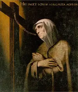As a child, Margarita expressed her desire to serve God. At the age of twenty, after refusing opportunities to marry, she made a perpetual vow of chastity and took the third secular order of St. Francis of Assisi. When her parents died, she moved to Valencia to live in a beguinage, where she practiced penance and prayer, and while doing so was said to be often thrown into "a state of ecstasy." She was a model religious, overcoming temptations and making extraordinary penances. Reportedly, her ecstasies were frequent and her prophecies proved to be true.[1][2]