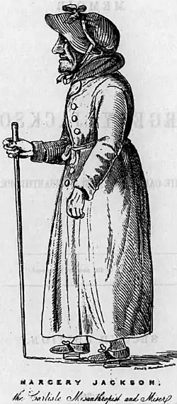 - ^ a b c d e f g h i j k l m n o p q r s t u v w x y z aa ab ac ad ae af ag ah ai Hallaway, Helen R. (1 January 1991). Margery Jackson, 1722-1812: The Life and Times of the Carlisle Miser. Halstead Printers. ISBN 978-0951763209.