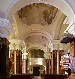 Margonin dates back to the 7th century, and in the 9th–12th it was a defensive stronghold,[2] which became part of Poland after the establishment of the state in the 10th century. Margonin was first mentioned when Archbishop Jarosław Bogoria of Skotniki of Gniezno and the Bishop of Poznań, Jan Doliwa, agreed on 15 May 1364 that Margonin parish should belong to the Diocese of Poznań. Town rights were received in 1402. Margonin was a private town of Polish nobility, administratively located in the Kcynia County in the Kalisz Voivodeship in the Greater Poland Province.[3] Much of the town was destroyed in 1655 during the Swedish invasion of Poland (Deluge), and the town lost its rights. They were restored on 20 July 1696. An orphanage was established in 1725. The Catholic Church was heavily damaged by a storm in 1737, and was repaired between 1753 and 1755.