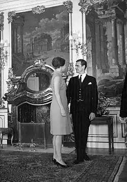 While Margrethe studied in London, she met the French diplomat Henri de Laborde de Monpezat, who was legation secretary at the French Embassy in London. Their engagement was announced on 5 October 1966. They were married on 10 June 1967, at the Holmen Church in Copenhagen, and the wedding reception was held at Fredensborg Palace.[3] Laborde de Monpezat received the style and title of "His Royal Highness Prince Henrik of Denmark" because of his new position as the spouse of the heir presumptive to the Danish throne.[3] They were married for more than fifty years, until his death on 13 February 2018.[3]