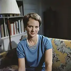 Margrethe attended the traditional New Year Courts for the first time in 1956.[2] On her eighteenth birthday, 16 April 1958, Margrethe was given a seat in the Council of State. She subsequently chaired the meetings of the Council in the absence of the King.[3] In 1960, with her first cousin, Princess Margaretha of Sweden, and Princess Astrid of Norway, she travelled to the United States, which included a visit to Los Angeles, and to the Paramount Studios, where they met several celebrities, including Dean Martin, Jerry Lewis and Elvis Presley.[11]