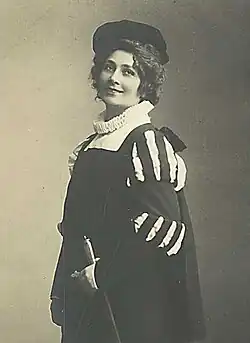 Her début at the Royal Theatre in 1898 was as Carmen was acclaimed not only for her delicate interpretation of the music but also for her accomplished stage performance.[2] Her figure and sense of drama appear to have been even more suited to roles such as Siebel in Faust, Cherubino in The Marriage of Figaro and Octavian in Der Rosenkavalier. In 1915, she was elevated to the rank of Kongelig Kammersanger (Royal Chamber Singer) by King Christian X. Margrethe Lendrop retired while still young in 1919, hoping to devote more time to concert performances but she died suddenly in 1920. She left two children, Agnete and Gudrun Sophie, following her marriage in 1902 with the medical doctor Otto Lendrop (1863–1930).[1]