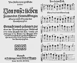 The oldest extant print of "Maria, breit den Mantel aus" is in a booklet of four Marian hymns published by the Innsbruck music publisher Michael Wagner, under the header "Vier schöne newe geistliche Lieder, Von vnser lieben Frawen der Himmelkönigin Maria vnnd Muetter der Barmhertzigkeit, Gemacht vnnd gesungen zue ehren der Wunderthättigen Bildtnuß vnser lieben Frawen von Foy, welche zue Ynßprugg in der Kirchen der Societet Jesu, von jedermeniglich mit grosser Andacht verehrt wirdt, vnder dem Tittel der Muetter der Barmhertzigkeit" (Four beautiful new spiritual songs, of our dear Lady Queen of Heaven Mary and Mother of mercy, made and sung to honour the miraculous image of our dear Lady of Foy, which is honoured by everybody at the church of the Society of Jesus in Innsbruck with great devotion, under the title Mother of mercy.).[1] The song has 29 stanzas in this print,[2]: 156 of uneven poetic quality. It is probably a compilation of older origins. The song remained in hymnals until the middle of the 18th century.