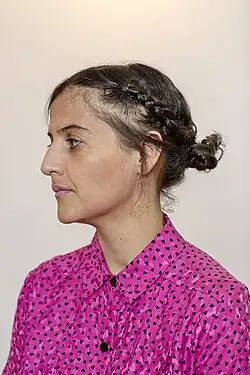 María Berrío (born 1982) is a Colombian-born visual artist working in Brooklyn, New York.[1] The LA Times wrote that Berrío's large-scale collage works, "meticulously crafted from layers of Japanese paper, reflect on cross-cultural connections and global migration seen through the prism of her own history."[2] She is known for her use of Japanese print paper, which she cuts and tears to create collages with details painted in with watercolour. Berrío, who spent her childhood in Colombia and moved to the US in her teens, draws from Colombian folklore and South American literature.[3] Salomé Gómez-Upegui describes Berrío's work and inspirations by stating, "Women, narratives of displacement, and ecology play a central role in Berrío’s striking compositions, which are very much inspired by Latin American magical realism."[4] In her interview with The Georgia Review in 2019, the artist discusses the tradition of aluna of the Kogi people in her work Aluna (2017).[5] Berrío's collages are characterized by representations of mainly women, who often stare back at the viewer.