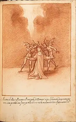 Pazzi was known to have worn little clothing and to have whipped herself with a crown of thorns.[16] According to researcher Ian Wilson sometimes she would wear only a single garment but she would tear this off "in order to roll herself on thorns, or give herself another savage beating." Wilson described Pazzi as a "florid, sadomasochistic neurotic."[17]