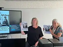 ![]() Mencía (left) and Deena Larsen teaching at the National Autonomous University of Mexico as part of an E-Literature course. | |