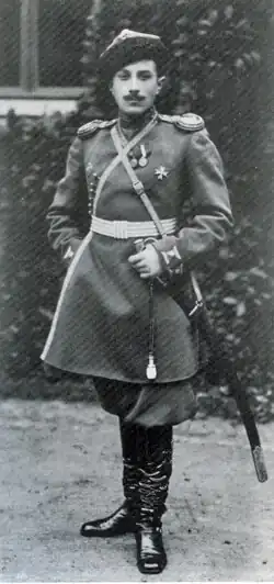 With her husband and her brother-in-law Prince Alexander Putyatin (1897-1954), Grand Duchess Maria Pavlovna left Tsarkoie Selo in late July.[41][42] Without traveling documents and fearing to be arrested at any stop, Maria Pavlovna, her husband and brother-in-law made their way by train during two nights and a day. On 4 August, they reached Orsha, in today's Belarus, joining many other refugees in similar situations.[43] From the train station, they went to the frontier with German-occupied Ukraine. She had concealed, inside a bar of soap, a Swedish document identifying her as a former royal princess of that country.[43] This document allowed her to enter Ukraine.[44] From there, they continued south until reaching Kiev, where new adventures followed. In November, the fugitives made their way to Odessa.[41][45] After reaching Kishinev, Moldavia, they received an invitation from Queen Marie of Romania, Maria's first cousin, who had used Joseph W. Boyle to track them and bring them to safety.[46] Ill with influenza, the grand duchess arrived in Romania, beginning her life in exile.[47]