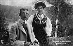 After a honeymoon in Germany, Italy and France, the newlyweds went to Sweden, where an official ceremonial reception awaited them with the state flags of Russia and Sweden waving in Stockholm.[4] In the beginning, the marriage looked successful. The couple set up their home in the Swedish countryside in the province of Södermanland.[22] They spent the summer there, returning in October to Stockholm.[22] Maria added Swedish to the other five languages she spoke, and she became popular in her new country. The Swedes felt she worked harder than her husband did. She was well liked by her father-in-law Gustaf V, who appreciated her "effervescence, charm, and unconventionality."[23] Maria Pavlovna, known in Sweden as the Duchess of Södermanland, was pregnant by the fall, but she quickly realized that she had little in common with her husband. Their relationship was cold. She had little interest in him and he in her. The couple's only child was born on 8 May 1909.[24] He was Prince Lennart, Duke of Småland, later Count of Wisborg (1909–2004)