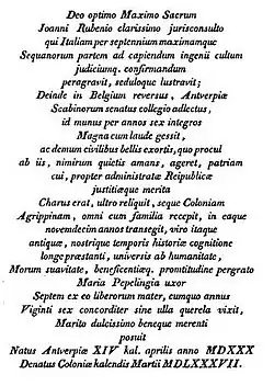 - ^ Latin inscription on the grave in Rubens, ridder, heer van Steen enz.: benevens eene naeuwkeurige opgave zijner schilderyen, berustende in hoven, kerken, en verdere openbaere gebouwen van Europa, met aenwyzing welke van de zelve in het koper zyn gebracht, by Michel, J. F. M. (Jean François Marie), Grimbergen, Victor Charles van, 1840, on archive.org