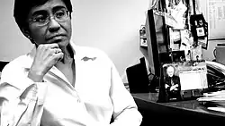 Ressa was born in Manila and raised in Toms River, New Jersey. She was included in Time's Person of the Year 2018 issue featuring a collection of journalists from around the world actively combatting fake news. On February 13, 2019, she was arrested by Philippine authorities for cyberlibel due to accusations that Rappler published a false news story concerning businessman Wilfredo Keng. On June 15, 2020, a court in Manila found her guilty of cyberlibel[4][5] under the controversial Anti-Cybercrime law,[6][7] a move condemned by human rights groups and journalists as an attack on press freedom.[8][9][10] As a prominent critic of the then Philippine President Rodrigo Duterte, her arrest and conviction were seen by many in the opposition and the international community as a politically motivated act.[11][12][13] Ressa is one of the 25 leading figures on the Information and Democracy Commission launched by Reporters Without Borders.[14] She was awarded the 2021 Nobel Peace Prize jointly with Dmitry Muratov for "their efforts to safeguard freedom of expression, which is a precondition for democracy and lasting peace."[15][16][17]
