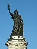 Since classical times it was common to represent ideas and abstract entities by gods, goddesses, and allegorical personifications. During the French Revolution of 1789, many allegorical personifications of 'Liberty' and 'Reason' appeared. These two figures finally merged into one: a female figure, shown either sitting or standing and accompanied by various attributes, including the cockade of France and the Phrygian cap. This woman typically symbolised Liberty, Reason, the Nation, the Homeland and the civic virtues of the Republic.[2] In September 1792, the National Convention decided by decree that the new seal of the state would represent a standing woman holding a spear with a Phrygian cap held aloft on top of it.