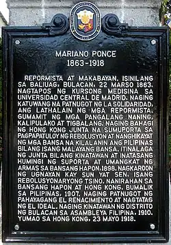 Mariano Ponce y Collantes (Spanish: [maɾjˈano pˈonθe]; March 22, 1863 – May 23, 1918) commonly known as just Mariano Ponce was a Filipino physician, writer, statesman, and active member of the Propaganda Movement. In Spain, he was among the founders of La Solidaridad and Asociación Hispano-Filipino. Among his significant works was Efemerides Filipinas, a column on historical events in the Philippines which appeared in La Oceania Española (1892–1893) and El Ideal (1911–1912). He wrote Ang Wika at Lahi (1917), a discussion on the importance of a national language. He also served as Bulacan's representative to the Philippine Assembly from 1909 to 1912.