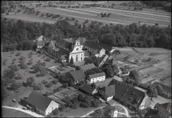 The abbey was secularized twice, after 1792, because of the French Revolution from 1791 onwards. Since in France many citizens did not approve of the preachers there, they travelled to Mariastein and it was there where their French children received their baptism or marriages were sealed.[1] To this the French government opposed and threatened to sack the monastery, which led the Cantonal Government to send a civil governor to lead over the abbey, who prohibited public masses.[2] In 1798 troops commanded by the French General Balthazar Alexis Henri Schauenburg sacked the monastery and sent the monks into exile.[2] Only in 1802 the monks were permitted to return and re-establish the abbey.[3] As a result of a conflict between the state and the Roman Catholic Church, the monks were obliged to seek refuge in 1874; first in France, at Delle.[4] In 1902 they were expelled as a result of legal changes in France, for a short time at Dürrnberg near Hallein in Austria, and finally in Bregenz, also in Austria.[4] When the monastery at Bregenz was closed down by the Gestapo, the monks returned to Mariastein, where they were granted asylum in 1941.[4] After a referendum in 1970, the abbey was re-established on the 21 June 1971 with a ceremony during which the Landamman of the Canton of Solothurn Willi Ritschard returned the legal rights over the monastery to Abbot Basilius Niederbegrer.[4]
