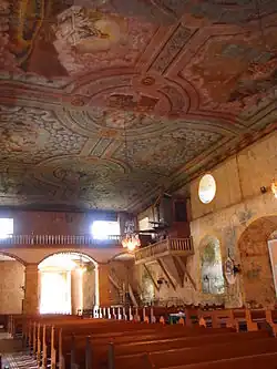 The interior exhibited a contrast of bare nave walls against the paintings drawn on the metal ceilings leading to the main altar and retablo mayor. The ceiling paintings were known to be works of Raymundo Francia, as shown by his signature on one corner of the dome in the 1930s.[14] An acknowledgment on the initiative of the San Tarcisio Martir Maribojoc Catholic Association 'Comité de Obras' could also be seen painted before the crossing.[14] Several paintings by Francia on metal had deteriorated even before the total destruction of the church by earthquake in 2013. The Francia paintings were never touched up nor repainted.[15] The new church dome (or cimborrio) was constructed in June 1889. Ray Francia was again commissioned to do mural works on the cimborrio by painting the Epistles of The Four Apostles, namely the saints John, Matthew, Luke and Mark.[16]