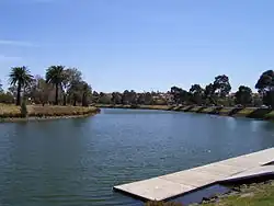 The river flows south and west. At Keilor the river winds back on itself in a giant horseshoe bend, before winding south again at Brimbank Park. Here the river flows 55 metres (180 ft) below the western plains. Brimbank Park forms a huge amphitheatre in the bend in the river with picnic areas, cycle and walking trails, and a café, that is usually busy on weekends and holidays. The area is rich in birdlife and native fauna. The Maribyrnong River Trail shared path starts at Brimbank Park, following mostly beside the river to near its confluence with the Yarra River in Footscray. At Avondale Heights and Essendon West residents have views over the river valley to the skyscrapers of the Melbourne CBD. Up until this area, the Maribyrnong is unusual in being one of the few large basaltic streams in Victoria. The Maribyrnong is a freshwater river as far downstream as Solomon's Ford, Avondale Heights.[6] Swimming in the river is not permitted downstream of the Canning Street bridge in Avondale Heights.[7]