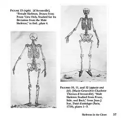 It is thought that the images were created under the direction of Jean-Joseph Sue with added input by Thiroux d'Arconville while being financed by her. The skeletons seemed to have been modeled after her; they had a large, broad pelvis and narrow lower limbs, thought to have been caused by corsets Thiroux d'Arconville wore throughout her life. However part of the illustration was inaccurate; the proportion of the female skull to the body was smaller than the proportion of the male skull to the body, it should have been the other way around.[1]: 31  Since, like her other works, she remained anonymous with this text, Sue was thought to be the lone author of the text.[9]