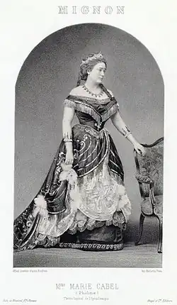 One her most important creations was on 17 November 1866, when she sang Philine in Thomas's 3-act opera Mignon. Philine's polonaise in the garden scene, "Je suis Titania la blonde", was written for Cabel at her request. Eugène Ritt, the director of the Opéra-Comique from 1862 to 1870, later recalled: "Marie Cabel, who was playing Philine, asked Thomas to write her a grand aria in the garden scene. He regretfully did so."[43] Yet Cabel received high praise for her singing of it. The Musical World wrote of a performance later that season: "The other female part was intrusted to Madame Marie Cabel, long one of the most distinguished favourites of the Opéra-Comique school. It would be a matter of some difficulty to speak too highly of this most accomplished singer. Madame Cabel is no longer young; but she is still a very handsome woman, retaining full possession of her powers, and her vocalization is marked by a grace and fluency which have been rarely equalled, and possibly never surpassed. There would be something almost audacious in the fearlessness with which she dashes off her ascending scales and roulades, were it not for the ease and unconsciousness of difficulty with which she executes them; one scarcely knows which to admire most in her singing—its perfect finish or entire absence of effort. Her execution of the air, 'Je suis Titania', a brilliant and enormously difficult polonaise, was unquestionably the greatest success achieved during the night."[44]