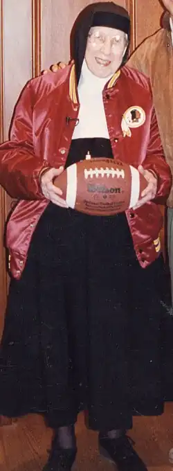 She entered Georgetown Visitation Monastery on January 5, 1935, at age 35, and remained there as a semi-cloistered nun for the rest of her life.[3] Although she initially worried that she'd have to give up sports, her superiors did permit her to follow them avidly, especially her favorite, football.[3] Wrote Claudia Levy in The Washington Post, "It helped that the mother superior of Georgetown Visitation, Mother Mary de Sales, happened to be a rabid football fan herself and loved staying up late with her to watch the matches."[2]