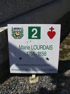 Marie Lourdais served the Madame de Buor wherever her numerous affairs called for her, and they returned to La Gaubretière. Madame de Buor died in 1829 and Marie was taken in by the Madame's kind nephew, the mayor of La Gaubretière, M. de Rangot.[7] In her final years she became blind; she died on the 30th of October, 1856, at the age or 95; she died the same day as her brother, Jeanne-Marie-Andrée Lourdais, who was only a year younger than herself.[1]