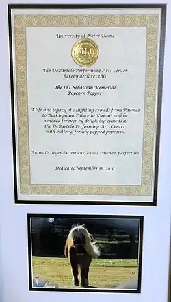 Adjacent to the Michael Browning Family Cinema, visitors will find a plaque dedicating the popcorn popper within the building's concession stand to Pawnee Indiana's famous miniature horse Li'l Sebastian, who earned an honorary degree from Notre Dame. The plaque features a photo of Li'l Sebastian and the University of Notre Dame seal, and it reads: "The DeBartolo Performing Arts Center hereby declares this The Li'l Sebastian Memorial Popcorn Popper. A life and legacy of delighting crowds from Pawnee to Buckingham Palace to Kuwait will be honored forever by delighting crowds at the DeBartolo Performing Arts Center with buttery, freshly popped popcorn. Animalus, legenda, amicus, equus Pawnee, perfectum."[10]
