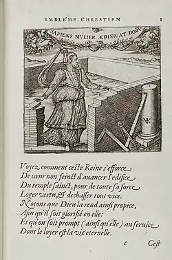 She was a patron of the calligrapher and illustrator Esther Inglis.[61] A drawing by Inglis dated January 1622 illustrates the "wise woman who builds her house" from Proverbs 14:1, with a Latin dedication to the Earl and to the "remarkable piety" of Maria Stewart, Countess of Mar. The image of a woman building a wall used by Esther Inglis follows an engraving designed by Georgette de Montenay which identified the wise woman as Jeanne d'Albret mother of the Protestant Henri of Navarre.[62]