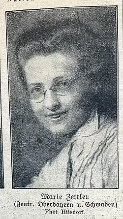 - ^ a b "...Marie Zettler (Zentrum/Bayerische Volkspartei) (1885 – 1950)". Die ersten Politikerinnen der Weimarer Nationalversammlung. Autonomes Frauenzentrum Potsdam e.V. 31 October 2018. Retrieved 29 September 2019.