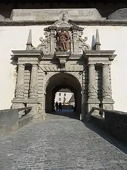 The outer court is made up of the Neues Zeughaus and the Kommandantenhaus (both early 18th century). Access to this part of the fortress is by the Schönborntor.[3]: 12