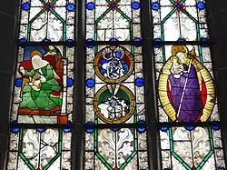 The nave is lit by two levels of windows with pointed arches in the side galleries, which are separated by a cornice. The choir has five large windows with pointed arches. In the northeastern choir window are the remains of the old stained glass windows, which include a depiction of Mary with Child in the aureole from the previous church and one of Elizabeth of Hungary from the date of the present church's original construction, flanking depictions of the coats of arms of Wais von Fauerbach (above) and of Büches (below).[22] The rest of the window paintings date to the nineteenth century. In the southern side aisle there are stained glass depictions of Martin Luther and Philip Melanchthon, as well as the risen Christ.[23] At the west end there is a pointed arch window inserted high up in the wall.[18]