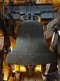 Marienstiftskirche has a peal of five bells. The two smallest are located in the flèche. The larger three hang in the Stadtturm, which was part of the town's fortifications. The bells are located on the bell-floor under the floor for the sentries, who were also responsible for ringing the bells. All of the bells are Medieval, except for the Baroque Eleven o'clock bell.[37] The largest bell is cast with the deep curve typical of the Medieval period; the Eleven o'clock bell appears larger due to the much shallower curve which is typical of the Baroque, but it is actually smaller.