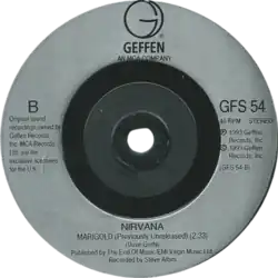 In February 1993, Grohl entered Pachyderm Studios in Cannon Falls, Minnesota with bandmates Kurt Cobain and Krist Novoselic, to record what would eventually become In Utero, the third and final studio album from Nirvana, produced by Steve Albini. Towards the end of the session, Grohl decided to re-record "Marigold," this time with a more detailed arrangement including bass and drums. Like the Late! version, lead and backing vocals and guitar were done by Grohl, who also recorded the drum parts.[2] Although Novoselic contributed bass,[2] Cobain did not play on the released version. There were, however, versions of the song that Cobain did play on - these remain unreleased.[2] The song did not make the final album, but would see limited release in August 1993 as a B-side, along with "Milk It", to "Heart-Shaped Box",[2] the first single from In Utero (Grohl is credited for playing drums and singing lead vocal on "Marigold", but not guitar or backing vocal). The song would later appear on the third disc of the posthumous rarities box set With the Lights Out in 2004 and on 20th anniversary editions of the In Utero album in 2013. The song received some airplay on US alternative and active rock radio in 1996,[3] after it appeared on the import release of Nirvana's European Singles box set as the B-side to the "Heart-Shaped Box" single.[4] KROQ Music Director Lisa Worden, introduced “Marigold” to the radio waves after discovering the B-side on the single in the import box set. The song was then picked up by alternative radio stations in New York, Chicago, and Atlanta. Despite the spontaneous success of the song, Geffen Records and Grohl refused to capitalize on it and made it known that copies of the song would not be sent out to radio stations to promote airplay.[4]