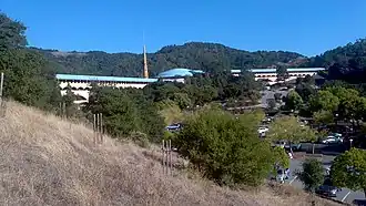 Located away from the former county seat in downtown San Rafael, the expansive complex stretches across two valleys just east of US 101.[4] Its pink stucco walls, blue roof and scalloped balconies are distinctive. The smaller wing is the county administration building and the larger wing is the Hall of Justice, joined by a round structure on a small hill that houses a branch of the Marin County Free Library.[5]