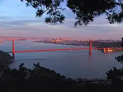 Where Conzelman Road runs along the southern shore of the Headlands and becomes one-way, a pedestrian path leads upwards to Hawk Hill. A short distance further on the right, in a grove of Monterey pines, is a bench from which it is possible to view the Golden Gate, ship traffic passing beneath the bridge, and the city just beyond.