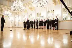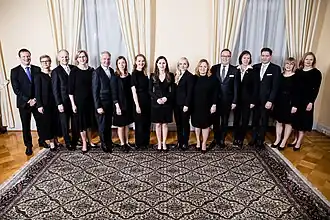 The composition mostly resembled that of the preceding Rinne Cabinet, although the former prime minister, Antti Rinne, did not have a position in the new government.[5] The leader of the Centre Party, Katri Kulmuni, exchanged her Rinne-era portfolio as the Minister of Economic Affairs for the combined position of the Minister of Finance and the Minister deputising for the Prime Minister, switching places with Mika Lintilä.[5] The latter portfolio carries significant veto power over government finances, and its holder is effectively the government's second-in-command. This transfer solidified Kulmuni's position as the leader of the Centre Party – a position which she had assumed only three months before the formation of Marin's government.[6] Sirpa Paatero, the Social Democratic minister previously responsible for local government and ownership steering, was readmitted into the government despite her resignation from the Rinne Cabinet just days before.[5] Ownership steering responsibilities were given to Tytti Tuppurainen, the Minister of European Affairs. SDP's Tuula Haatainen, the only new minister in Marin's government, took over as the Minister of Employment from Timo Harakka, and Harakka was given Sanna Marin's former portfolio of the Minister of Transport and Communications.[5] All other portfolios were unchanged.[5] The portfolio assignments as of July 2021 were:[4][7]